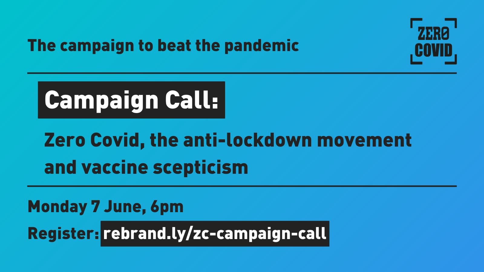 On Monday 7 June at 6pm we’ll hold an open campaign call to on the subject of ‘Zero Covid, the anti-lockdown movement and vaccine scepticism’.